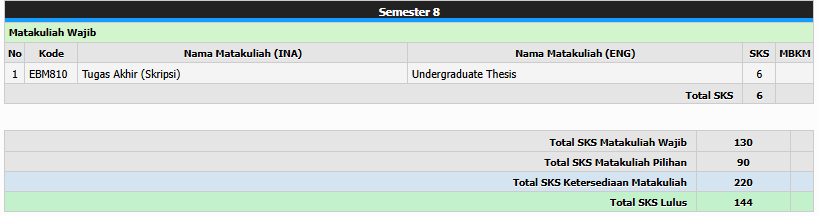 Kemajuan belajar mahasiswa dievaluasi berdasarkan sistem evaluasi kemajuan belajar yang meliputi ujian tengah semester, ujian akhir, kuis, dan penyelesaian tugas rumah dan praktikum.